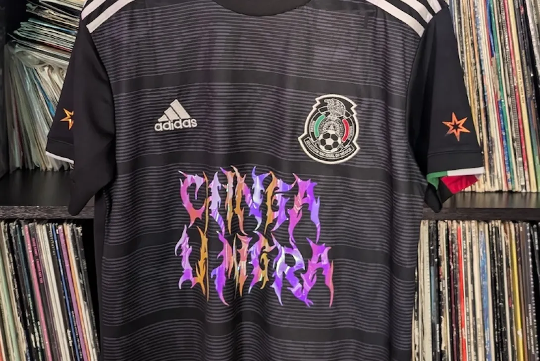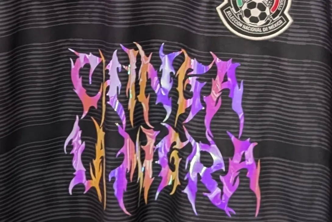 - Exclusive Custom Graphic: Features a striking, hand-styled gothic "CHINGA LA MIGRA" print in a vibrant purple-to-pink gradient, adding a rebellious edge to the traditional kit.