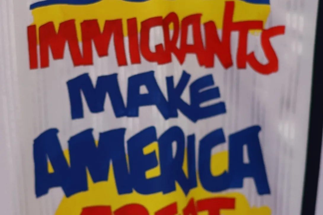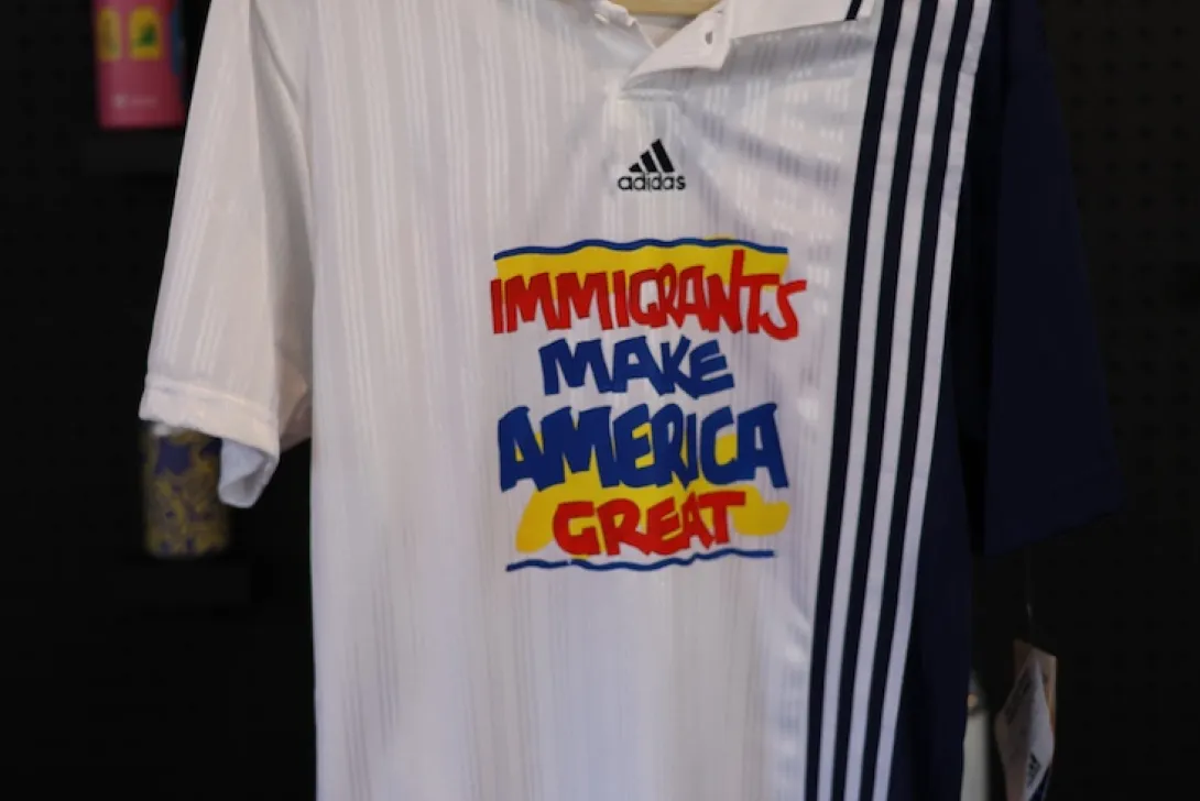 - High-Impact Custom Graphic: The center of the jersey features a bold, multi-colored graphic that reads "IMMIGRANTS MAKE AMERICA GREAT." The text uses a vibrant mix of red, blue, and yellow with a hand-drawn, illustrative feel, set against a classic white background for maximum contrast.